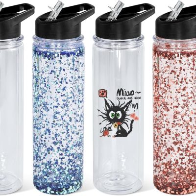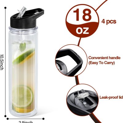 18oz 4 Pack Double Wall Clear Water Bottle Bulk Plastic Snow Globe Tumbler with Handle Lid, Acrylic Pre-Drilled Hole With Stopper Sippy Snow Globe Water Bottle for Scool Sport DIY Gift