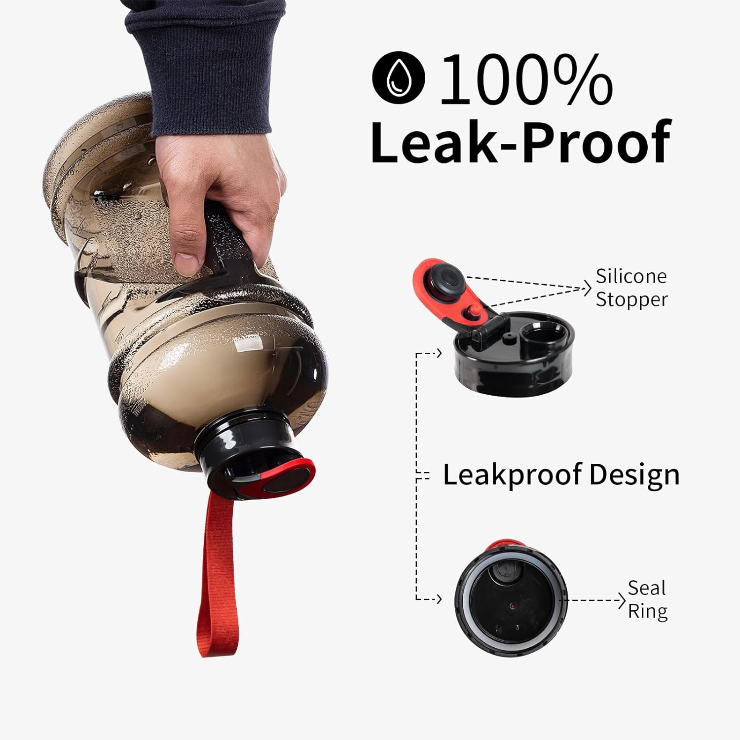 - 100% Leakproof and Easy to Clean : Our water bottle lid has a built-in sealing silicone ring, 360-degree rotation will not leak, Note: Just clean this large water bottle with baking soda and vinegar. Do not drop bottles, do not dishwasher safe, and do not use hot liquids