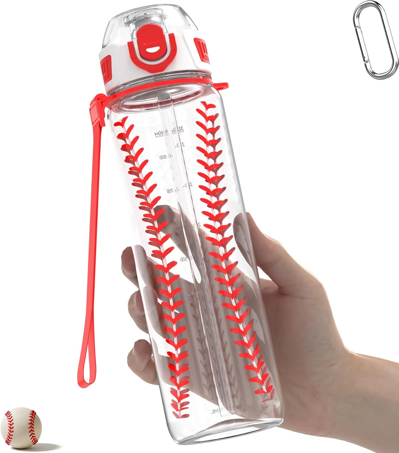 • Pattern: Realistic baseball exterior, even the stitch lines are slightly 3D touch textured for extra game passion. Great gift for a baseball fan/teen: so eye-catching! ● Vol Markers: Both milliliter and fluid ounce are on the volume scale. ● Accessories: Includes a 5 cm long silver-colored O-shape aluminum carabiner, so you can latch onto any backpack. ● NOT A TOY. For drinking use only.