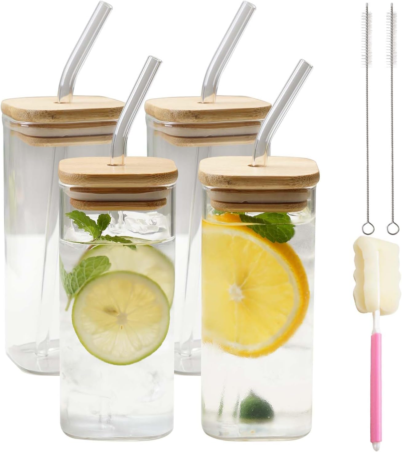Glass Cups with Lids & Straws 4 pcs Set Square shaped, Drinking Glasses Beer Glasses Tumblers Cups Water Bottles for Iced Coffee, Cocktail, Beer, Soda, Whiskey