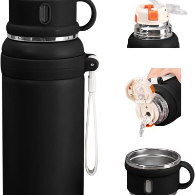 800ml 3-in-1 Double wall vacuum Leakproof stainless steel wide mouth insulated water bottle; tea tumbler with straw,cup,lid and lifting rope; travel coffee thermoses hot drinks; cold thermal flask