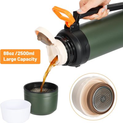 88oz Large Coffee Thermo for Travel, 2500ml Insulated Stainless Steel Water Bottle with Cup and Handle, Water Jug for 24hr Hot and Cold drinks, Vacuum Flask for Camping, Fishing & Working, Olive