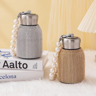 Bling Insulated Water Bottle Double Wall Stainless Steel Vacuum Flask with Glitter Rhinestones Diamond 10 oz Keep Cold Water Bottle with Pearls Bracelet Handle (Silver Diamond)